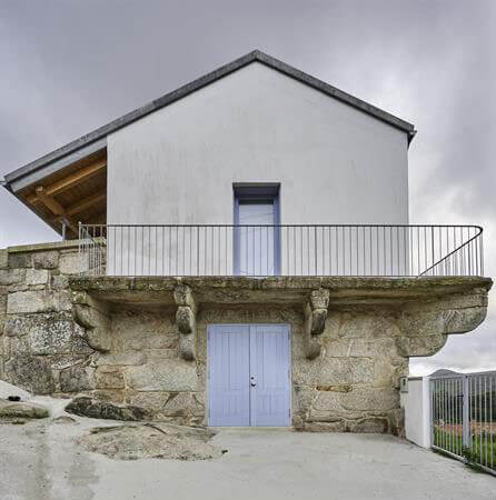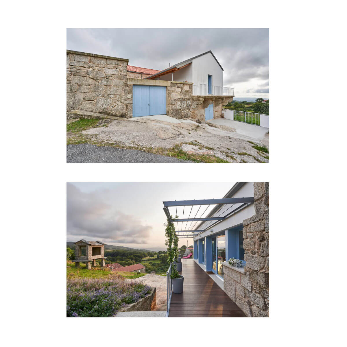 El diálogo entre interior y exterior se resuelve mediante la disposición de grandes carpinterías de madera color azul acompañadas de diversas tipologías de miradores que conectan con el paisaje circundante.